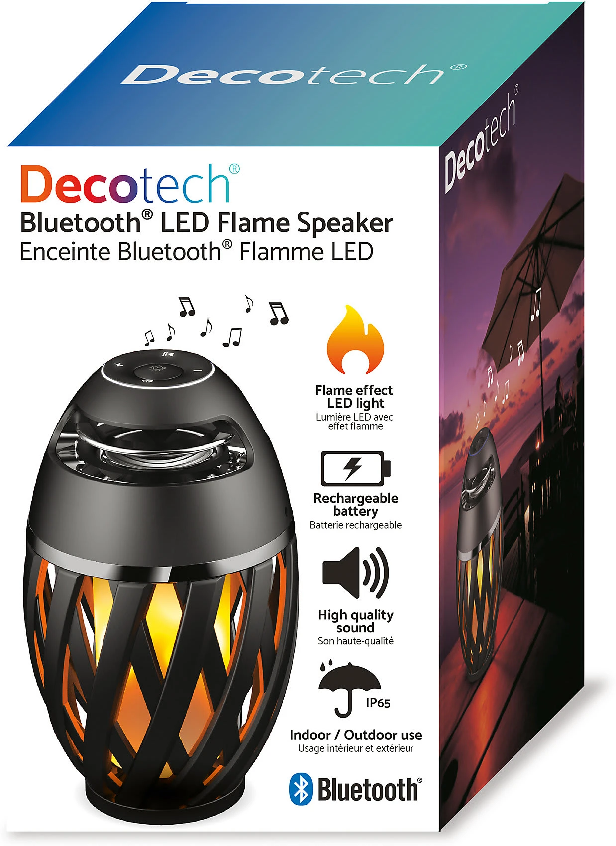 Bluetooth Lautsprecher von decotech mit 10 Watt für die Musikwiedergabe und dekoratives weiches LED-Licht mit flackerndem Flammen-Effekt.