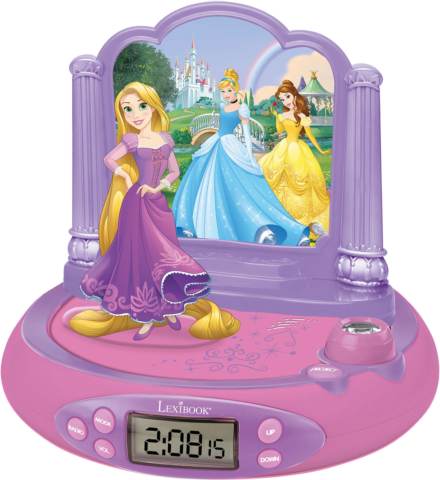 Rapunzel Wecker mit Radiofunktion und Projektor, der auf Knopfdruck die Zeit an die Decke projeziert! Per Druck auf den Wecker kann ein Nachtlicht für 15 Minuten aktiviert werden. Per Knopfdruck ertönen auch 4 Geräuscheffekte passend zum Thema „Rapunzel“.