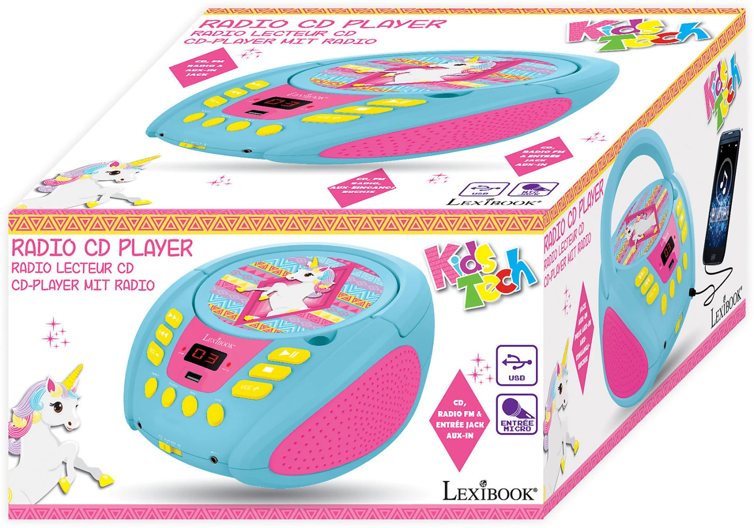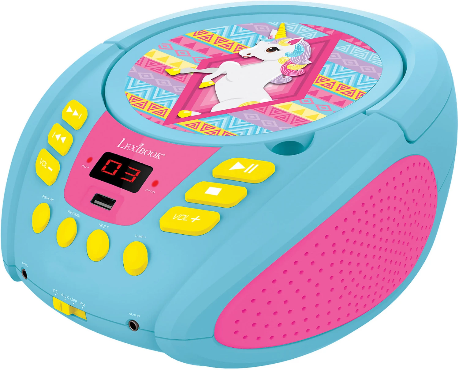 Tragbarer CD-Spieler für Kinder im trendigen Einhorn-Design mit Aux-Anschluss zur Wiedergabe externer Geräte wie Handy oder MP3-Player.