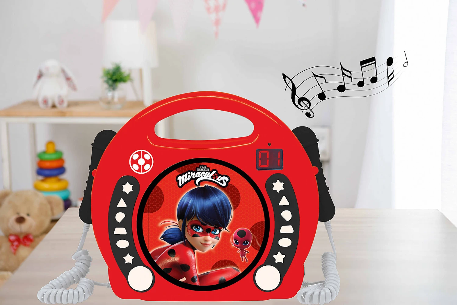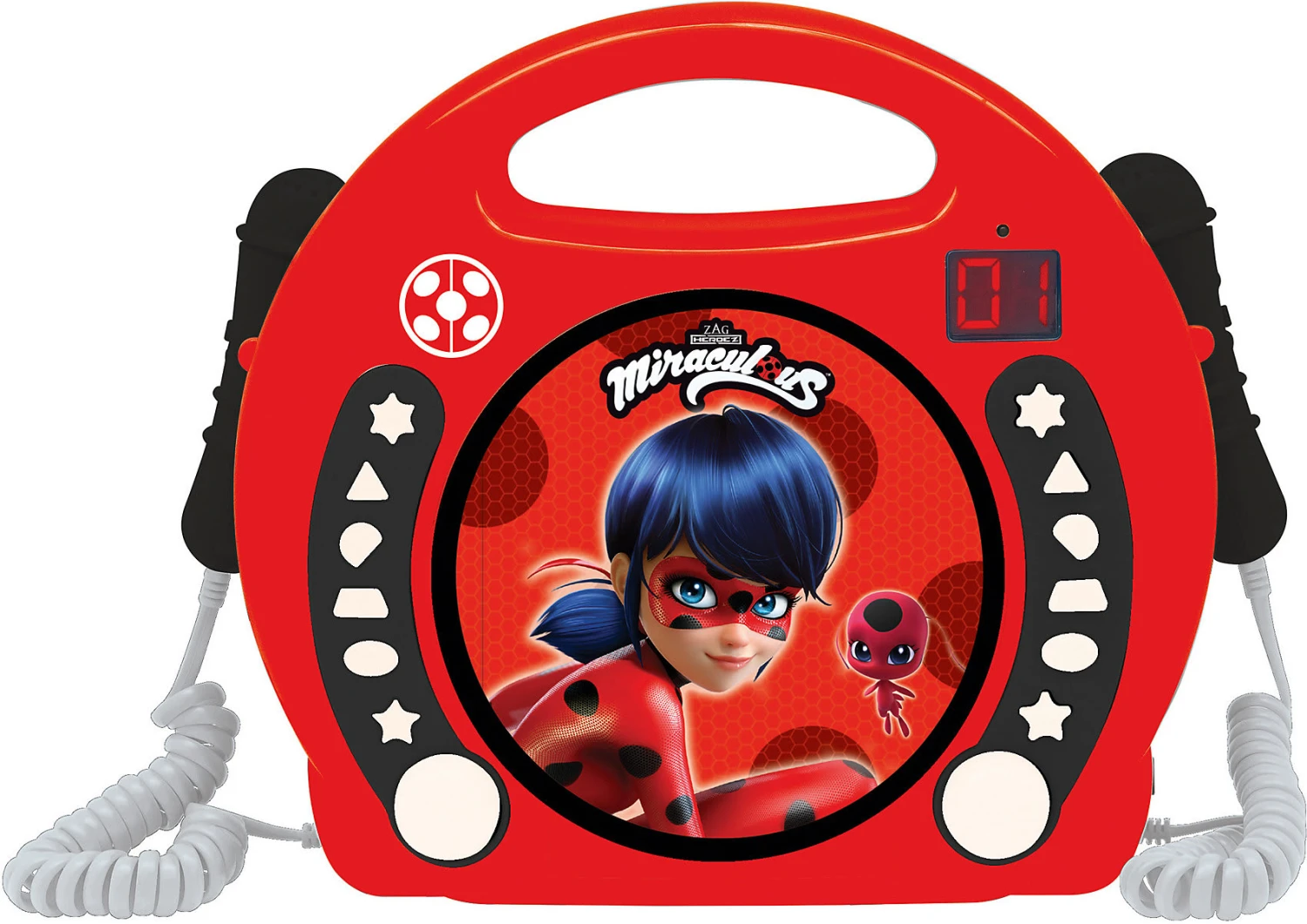 Der Karaoke Player Miraculous mit 2 Mikrofonen lässt die Herzen kleiner Fans höher schlagen. Sie können Lieder singen oder einfach nur die Musik genießen. Dabei enthält die Karaoke Maschine 2 Mikrofone, sodass der Spielspaß im Duo mit Freunden oder der Familie erlebt werden kann. Zudem ist ein Kopfhöreranschluss in dem CD-Player enthalten, damit die Musik auch für sich allein gehört werden kann. Dank des Batteriebetriebs lässt sich das Gerät auch mit nach draußen nehmen. Anhand des praktischen Tragegriffs können die Kleinen sogar eigenständig ihr Spielzeug transportieren.